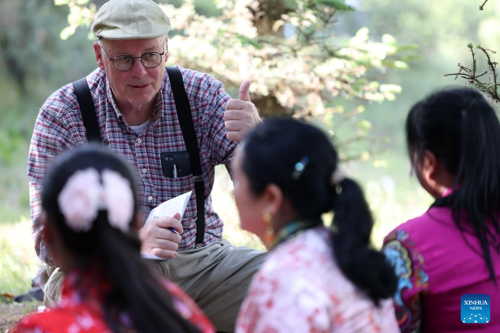 Frank Kouwenhoven talks with Hua'er singers in Minxian County, northwest China's Gansu Province, June 11, 2025. (Xinhua/Chen Bin)