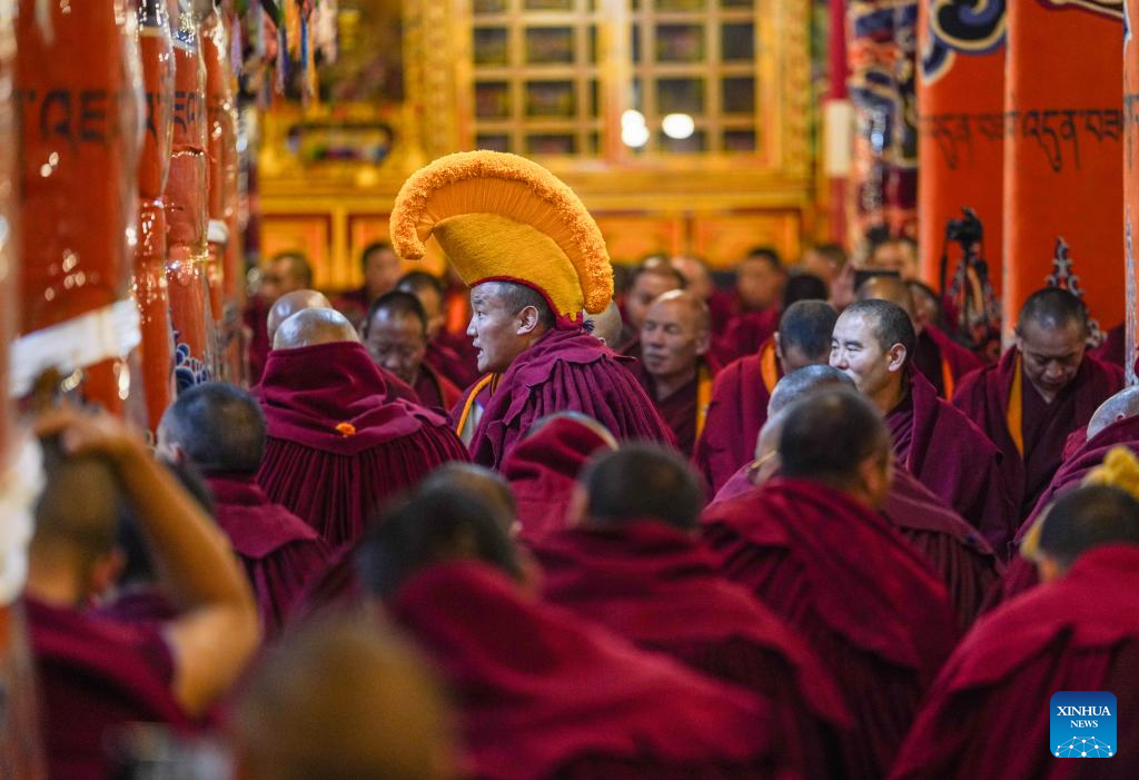 A preliminary examination for the Geshe Lharampa is held at the Ganden Monastery in Lhasa, capital of southwest China's Xizang Autonomous Region, July 15, 2025. A total of 13 monks from multiple monasteries are in the process of completing a preliminary examination for the Geshe Lharampa, the highest academic degree in the exoteric teachings of the Gelug school of Tibetan Buddhism. Geshe Lharampa, which means "intellectual" in the Tibetan language, is the equivalent of a doctoral degree in modern education. (Xinhua/Jigme Dorje)