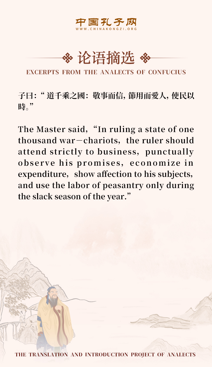 The Master said,“In ruling a state of one thousand war-chariots,the ruler should attend strictly to business,punctually observe his promises,economize in expenditure,show affection to his subjects,and use the labor of peasantry only during the slack season of the year.”