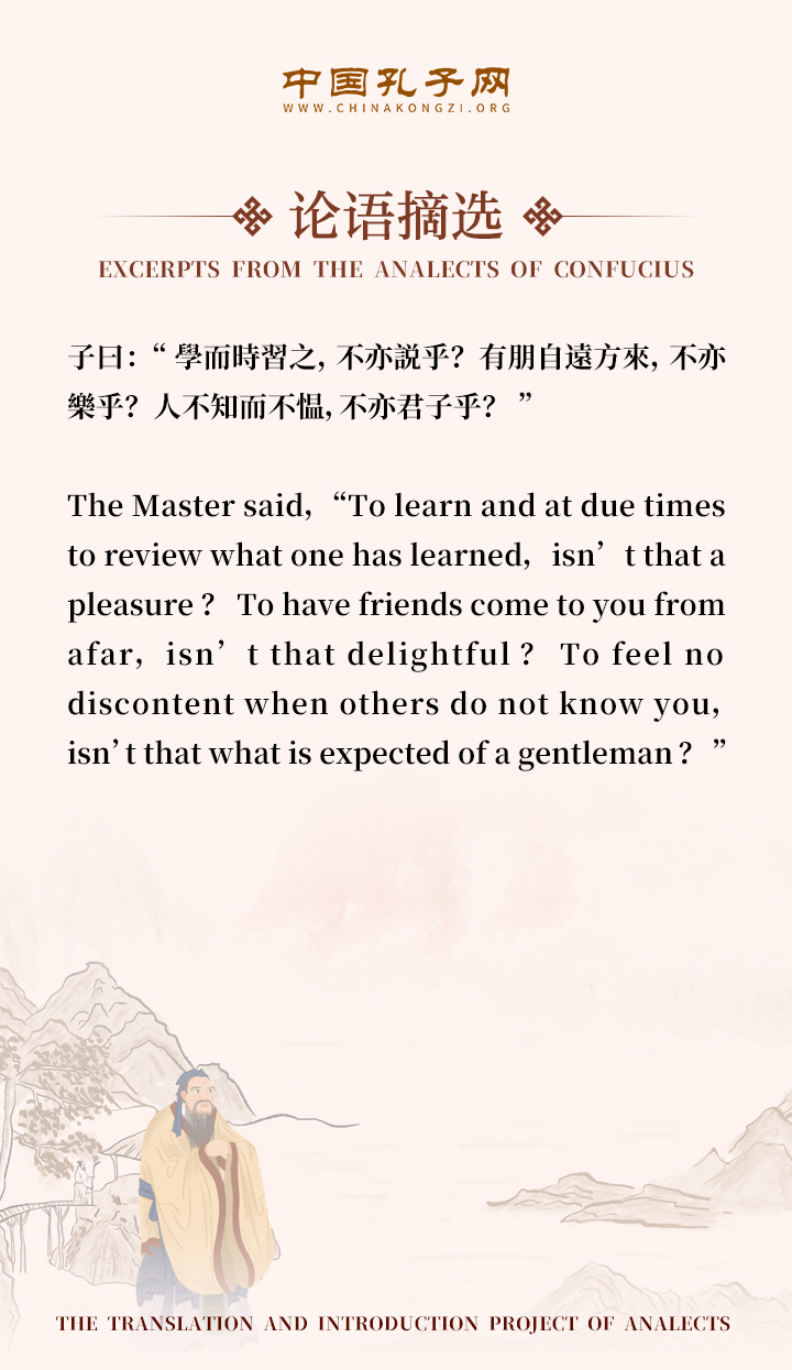 The Master said,“To learn and at due times to review what one has learned,isn’t that a pleasure? To have friends come to you from afar,isn’t that delightful? To feel no discontent when others do not know you,isn’t that what is expected of a gentleman?”