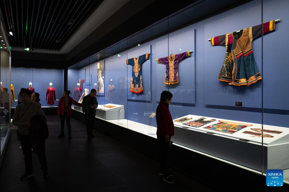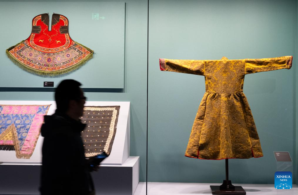 People visit an exhibition titled "Cocoon of Traditions: Silk in the National Cultures of Eurasia" at Hubei Provincial Museum in Wuhan, central China's Hubei Province, Nov. 22, 2024. The exhibition, which opened here on Nov. 22, showcases 283 pieces of silk textiles dating back from the 19th century to the first half of the 20th century from the Russian Museum of Ethnography. (Xinhua/Xiao Yijiu)