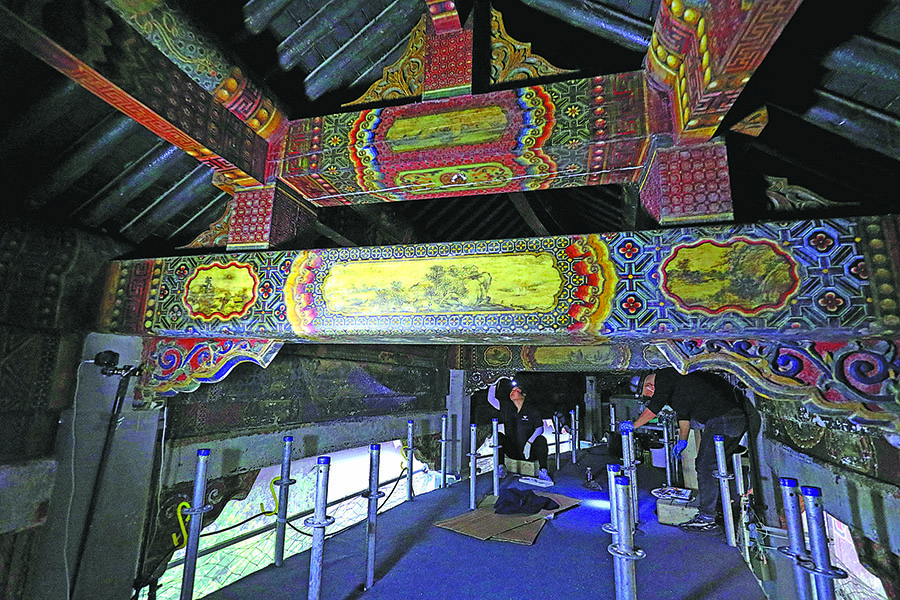 A relic restorer works on a painting on an arcade. [PHOTO BYZHU XINGXIN/CHINA DAILY]