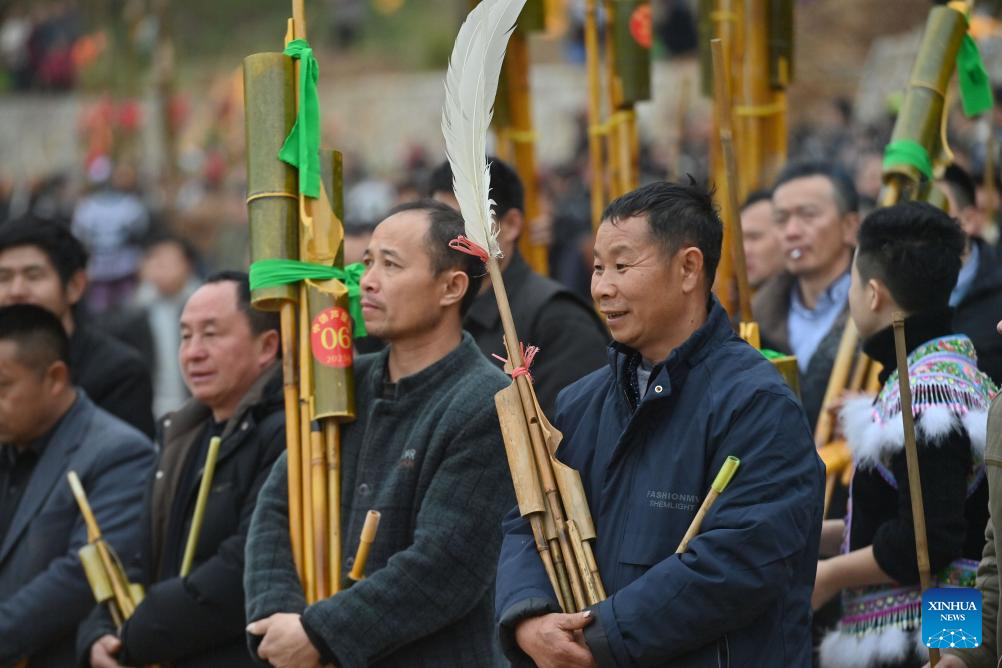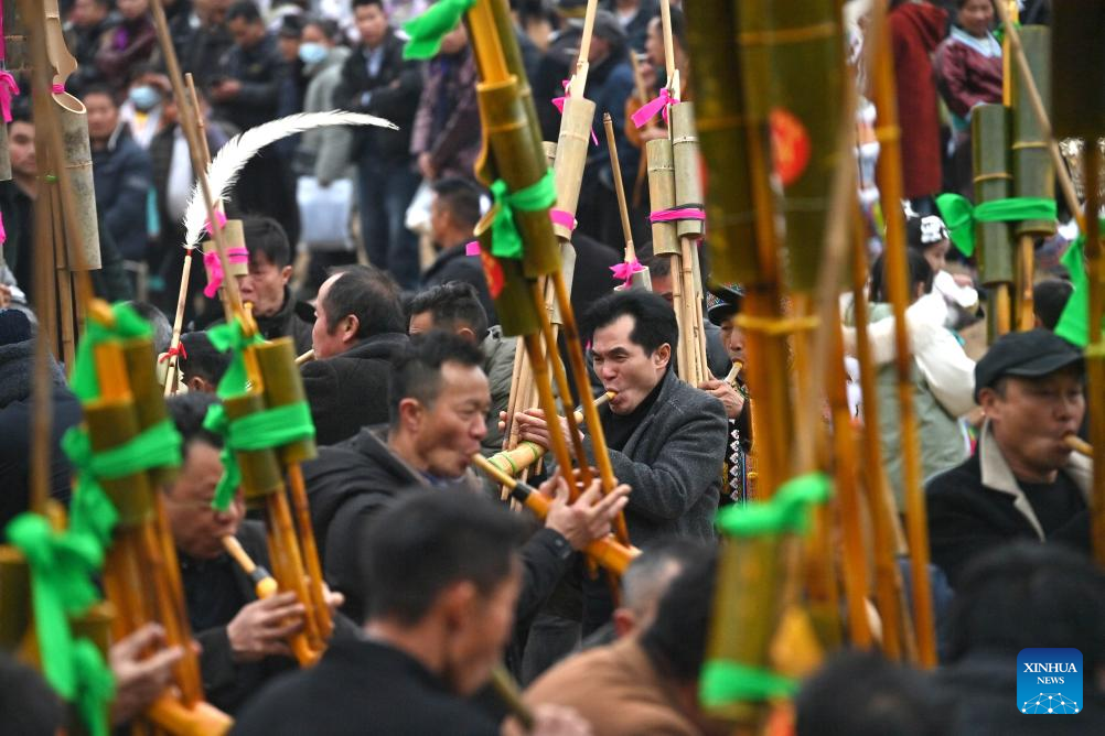 People blow Lusheng, a traditional reed-pipe wind instrument, during the "Bainiaoyi" Lusheng festival in Gandong Township, Rongshui Miao Autonomous County of Liuzhou, south China's Guangxi Zhuang Autonomous Region, Feb. 5, 2025. During "Bainiaoyi" Lusheng festival, a traditional festival annually held in Gandong Township, people of different ethnic groups gather together to demonstrate traditional ethnic attire, blow Lusheng, a traditional reed-pipe wind instrument, and perform traditional dancing. (Xinhua/Huang Xiaobang)