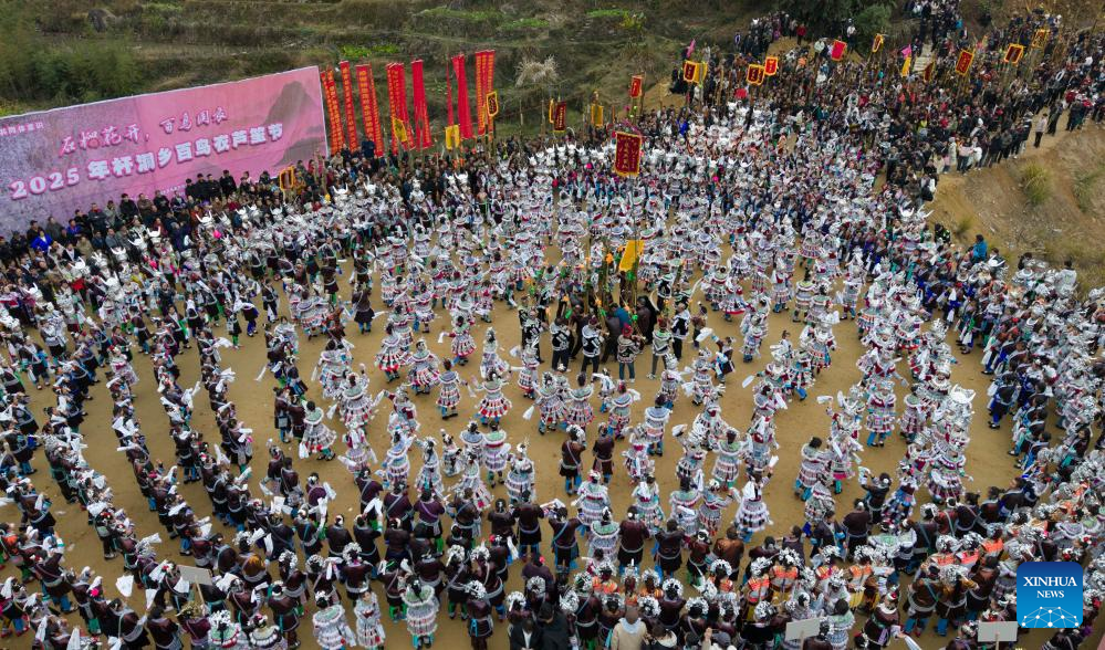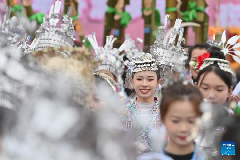 Women of Miao ethnic group stage a folk performance during the "Bainiaoyi" Lusheng festival in Gandong Township, Rongshui Miao Autonomous County of Liuzhou, south China's Guangxi Zhuang Autonomous Region, Feb. 5, 2025. During "Bainiaoyi" Lusheng festival, a traditional festival annually held in Gandong Township, people of different ethnic groups gather together to demonstrate traditional ethnic attire, blow Lusheng, a traditional reed-pipe wind instrument, and perform traditional dancing. (Xinhua/Huang Xiaobang)