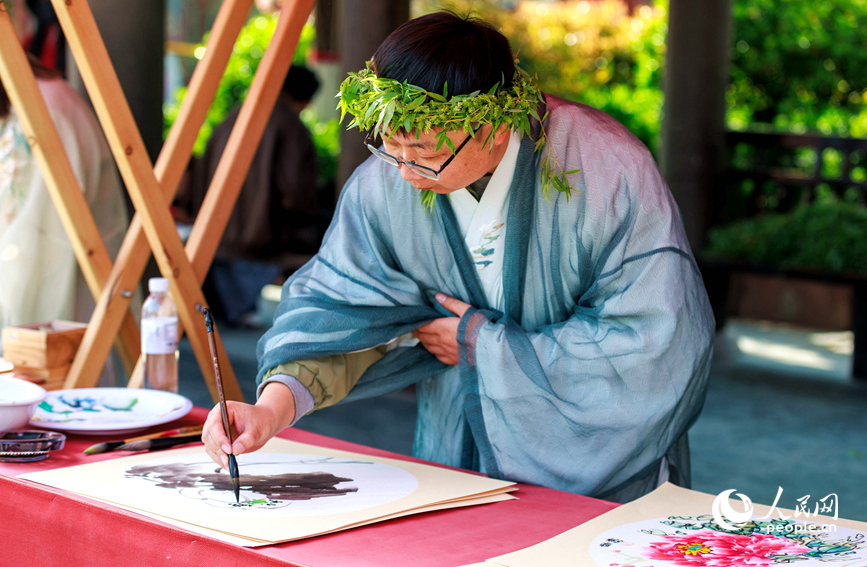 An artist creates a traditional Chinese ink and wash painting at a fair featuring intangible cultural heritage at the Millennium City Park in Kaifeng city, central China's Henan Province, during the 2025 Kaifeng Qingming Cultural Festival. (People's Daily Online/Xiao Yimu)