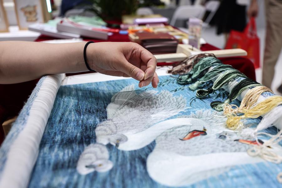 An exhibitor demonstrates Xiang embroidery, a national intangible cultural heritage, at the 5th China International Consumer Products Expo (CICPE) in Haikou, south China's Hainan Province, April 15, 2025. (Xinhua/Zhang Liyun)