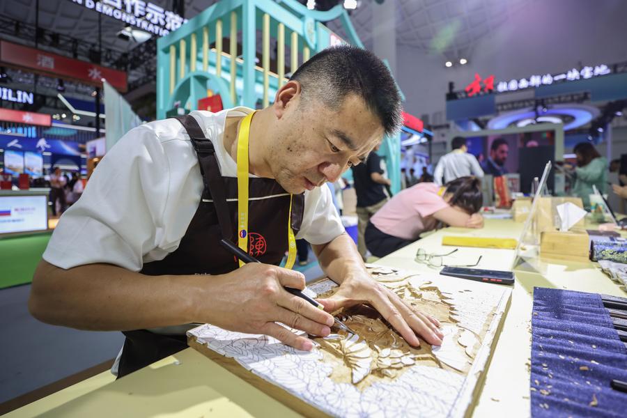 An inheritor of intangible cultural heritage demonstrates Dongyang Wood Carving, a national intangible cultural heritage, at the 5th China International Consumer Products Expo (CICPE) in Haikou, south China's Hainan Province, April 15, 2025. (Xinhua/Zhang Liyun)