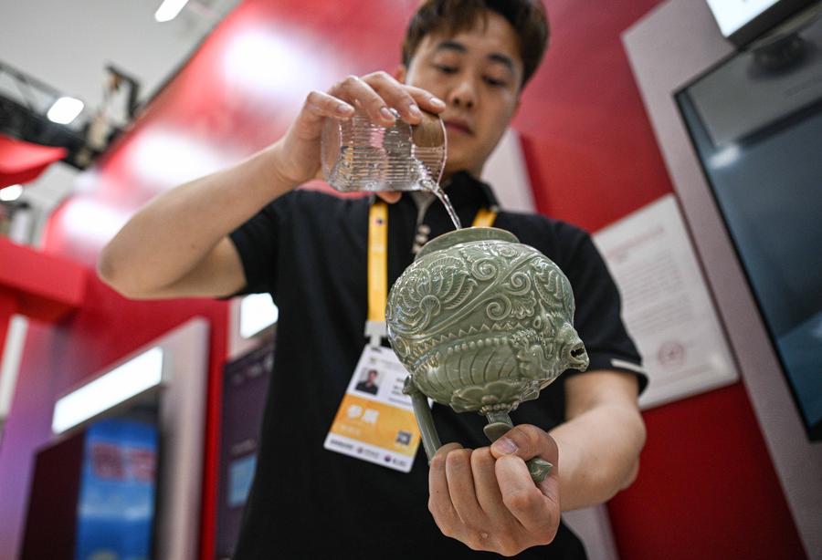 An exhibitor displays a product of Yaozhou kiln ceramics at the 5th China International Consumer Products Expo (CICPE) in Haikou, south China's Hainan Province, April 15, 2025. (Xinhua/Pu Xiaoxu)