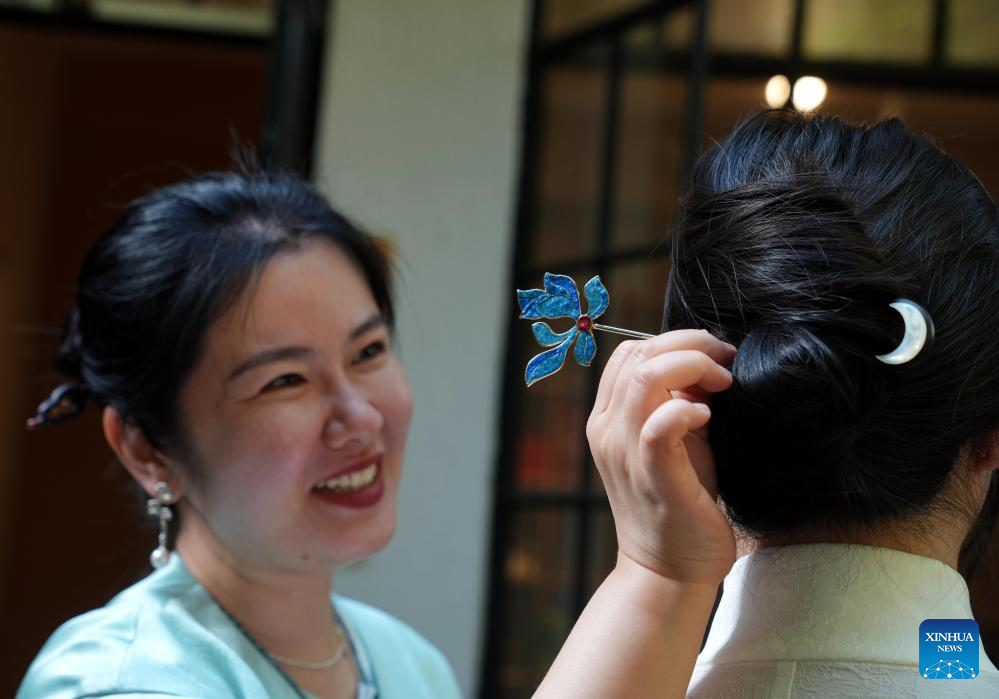 Li Wen fits a hair accessory for a girl at "Jinkun Xinshe", a traditional Chinese-style handicraft studio, in Xuhui District of Shanghai, east China, April 18, 2025. "Jinkun Xinshe" was founded by Si Fangfang and Li Wen, who have converted a foreign-style house into a tranquil and elegant space to offer traditional handicraft courses such as bracelet making, rope braiding, incense crafting, and gold foil painting.(Xinhua/Liu Ying)