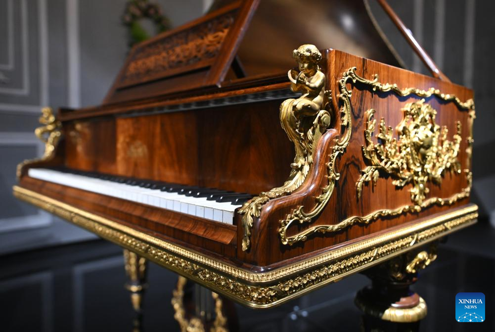 This photo taken on May 11, 2025 shows part of a French piano from late 18th century displayed at the Chengdu Xin Smart Music Museum in Chengdu, southwest China's Sichuan Province. Chengdu Xin Smart Music Museum, home to a collection of over 300 instruments from all over the world, is designed to enable an immersive experience for visitors. With technologies such as 3D imaging, holographic theatres, and digital scene restoration, it reflects virtual historical scenarios, tells stories behind music works, and sheds light on technology innovations in those instruments. The museum has received about 50,000 visitors in since it opened on April 30, 2024. (Xinhua/Liu Kun)