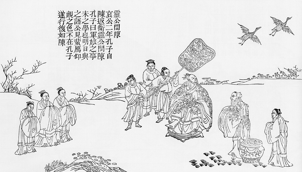 At the 2nd year of the reign of Duke Ai of Lu state, Confucius went back from Chen state to Wei state. Duke Ling of Wei state asked Confucius about military affairs of Chen state. Confucius know about army array, but he hated war, so he didn't want to talk about it. He said to Duke Ling, "You can ask me anything about music, rites and sacrifices. In terms of army array, I have never learned about it." What he said made Duke Ling unhappy, so he neglected Confucius the next time they met. When Confucius was talking to him, he looked up and watched the flying wild geese. Confucius went back and told his disciples, "I think we might not be able to stay here anymore. Let's just leave." So they left Wei state and went back to Chen state.