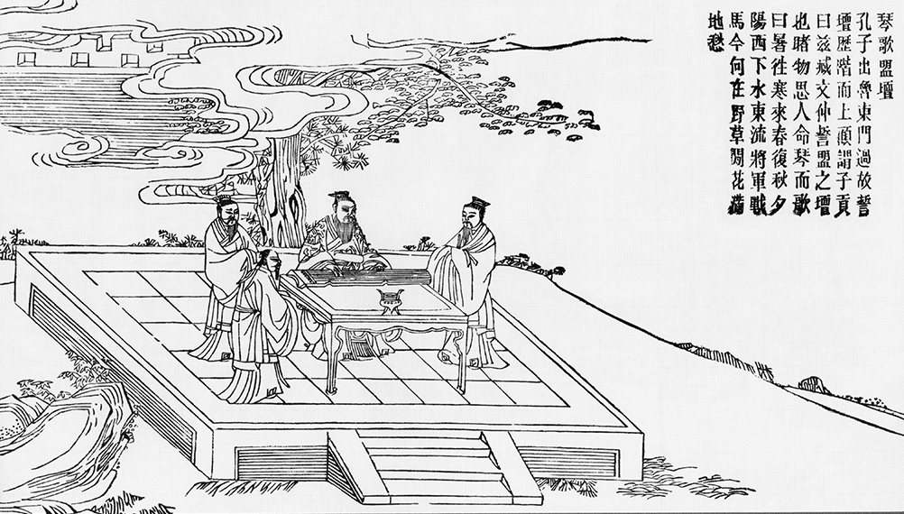When Confucius went out from the east gate of the capital city of Lu state, he passed by the Xing altar. So he walked up the steps, turned back and said to Zigong, "This is the place where Zang Wenzhong (a former minister of Lu state) vowed to alliance." And then, Confucius took out his qin and sang, "Seasons pass year after year. The sun sets in the west while the river runs to the east. The general's war horses cannot be seen here anymore. I could only see wild grass and flowers which bearing my worries."
