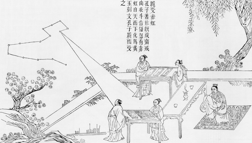 Having completed his works, Confucius fasted and reported piously to the Beidou (the Big Dipper). Suddenly, a red light descended from the sky and transformed itself into a block of yellow jade with words inscribed on. Then Confucius knelt down to accept it.
