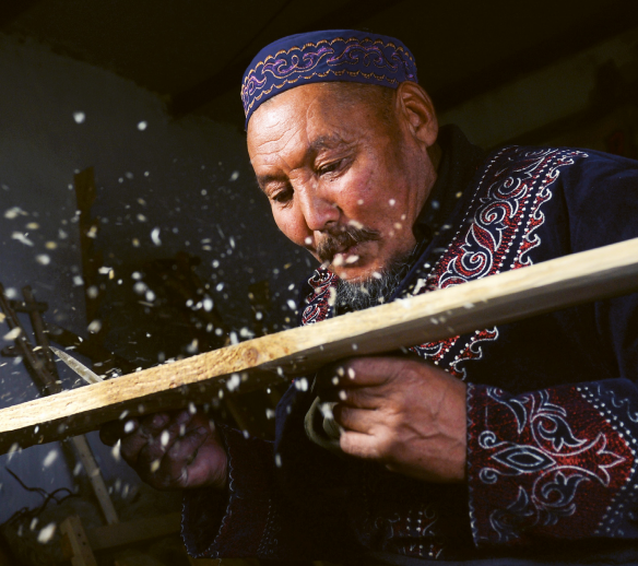 スランベックさんの工房の壁には、毛皮スキーを作るためのさまざまな道具が整然と掛けられ、ドアの脇に置かれた大きなバケツには馬の皮が浸され、ドアの左側の木の棚には、これまでに作られたさまざまな大きさの毛皮スキー板が並べられている。「私の父は大工で、私の初めての毛皮スキー板は、父がシロマツと馬と牛の皮で作ってくれたものでした。14歳から毛皮スキーの工芸を父から教わりました。毛皮スキーの工芸はわが家で5世代100年近く続いており、ご先祖さまが残してくれた工芸をなんとしてでもつないでいきたいです」と、スランベックさんは語る。彼の幼い頃の記憶では、毎年冬になると、祖父と父は皮の帽子、コート、ズボンを身に着け、さらに毛皮のスキーを履いて山を越え、狩りや薪集めをしていた。