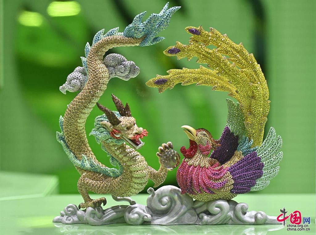 上海の消費財展示エリアのスワロフスキー展示エリアで9日、龍と鳳凰を象った作品が展示された。説明によると、これは約3万5000個のスワロフスキー模造クリスタルを使用し、職人が308時間かけて作ったものだ。