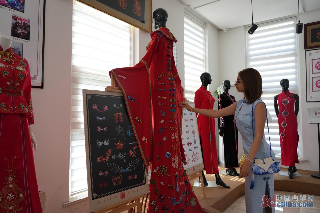 見学の過程で、外国メディアの記者たちは工坊内に展示されている盤扣で作られた様々な工芸品に惹かれ、これらの作品は華やかで上品で、あるいはシンプルで気前がよく、どれも独創的で、感嘆させられる。その中で、盤扣はチャイナドレスの装飾要素として、独特なデザインと美しい工芸を持っていて、心を込めて編むことと結びつけることを通じて、盤扣は各種の美しい形と図案を現して、チャイナドレスに独特な趣を加えた。「とてもきれいで、気に入っています」とドバイからの記者はチャイナドレスを試着して展示し、東洋の伝統衣装がもたらす美学体験を体験した。