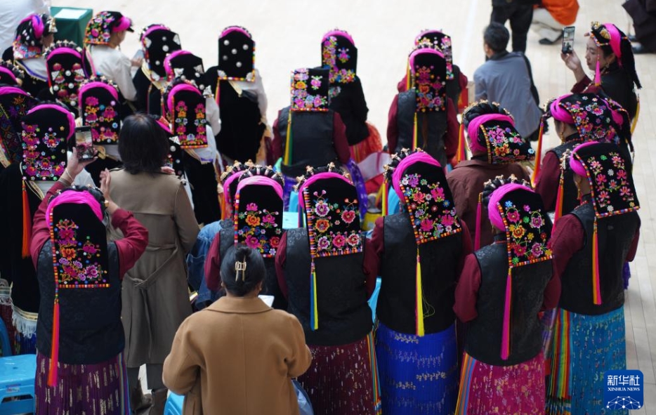 四川省甘孜蔵族自治州丹巴県の県城(県庁所在地)で、イベントに参加する、頭に嘉絨蔵族刺繍のスカーフをかぶった女性(10月11日撮影・呂明響)。