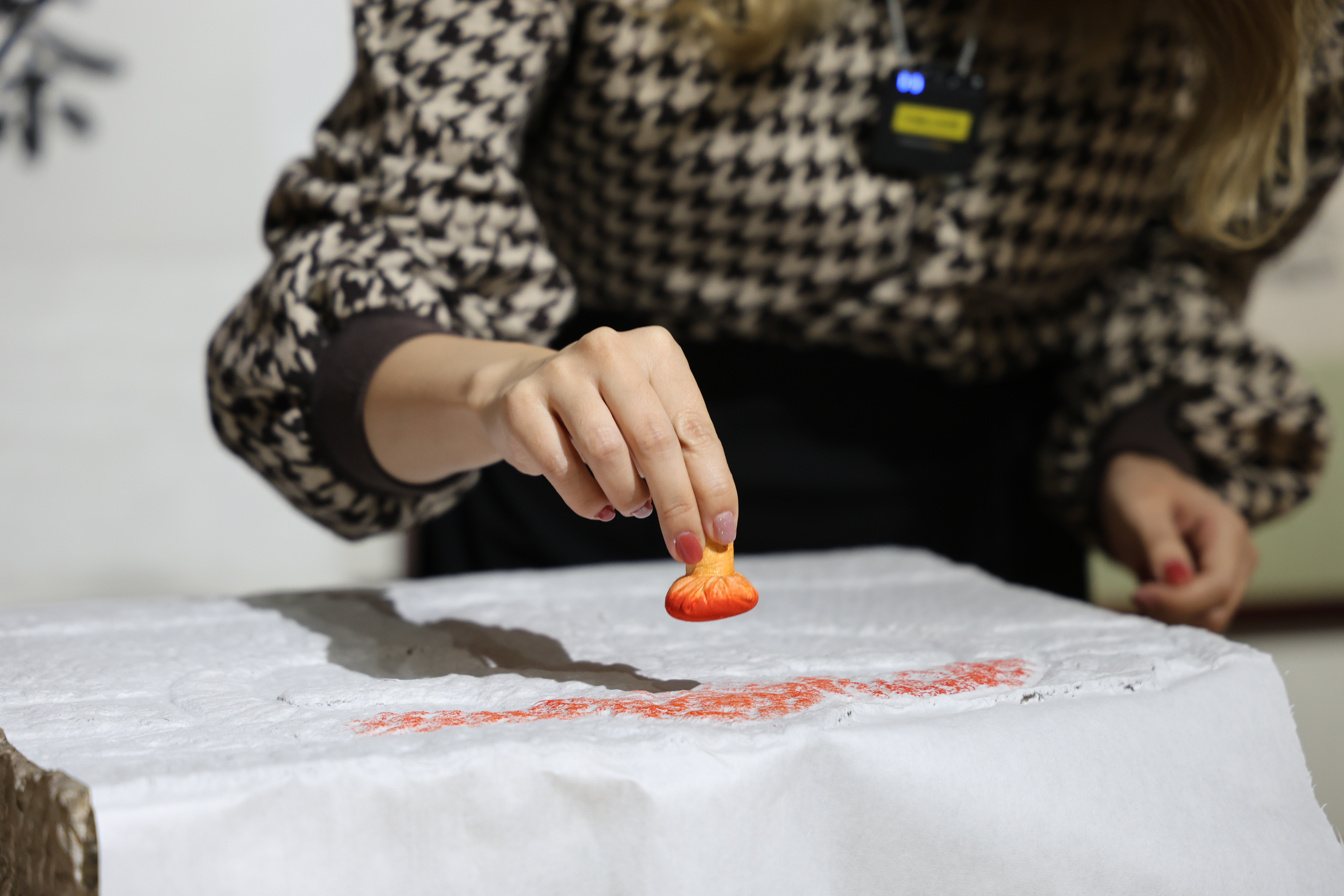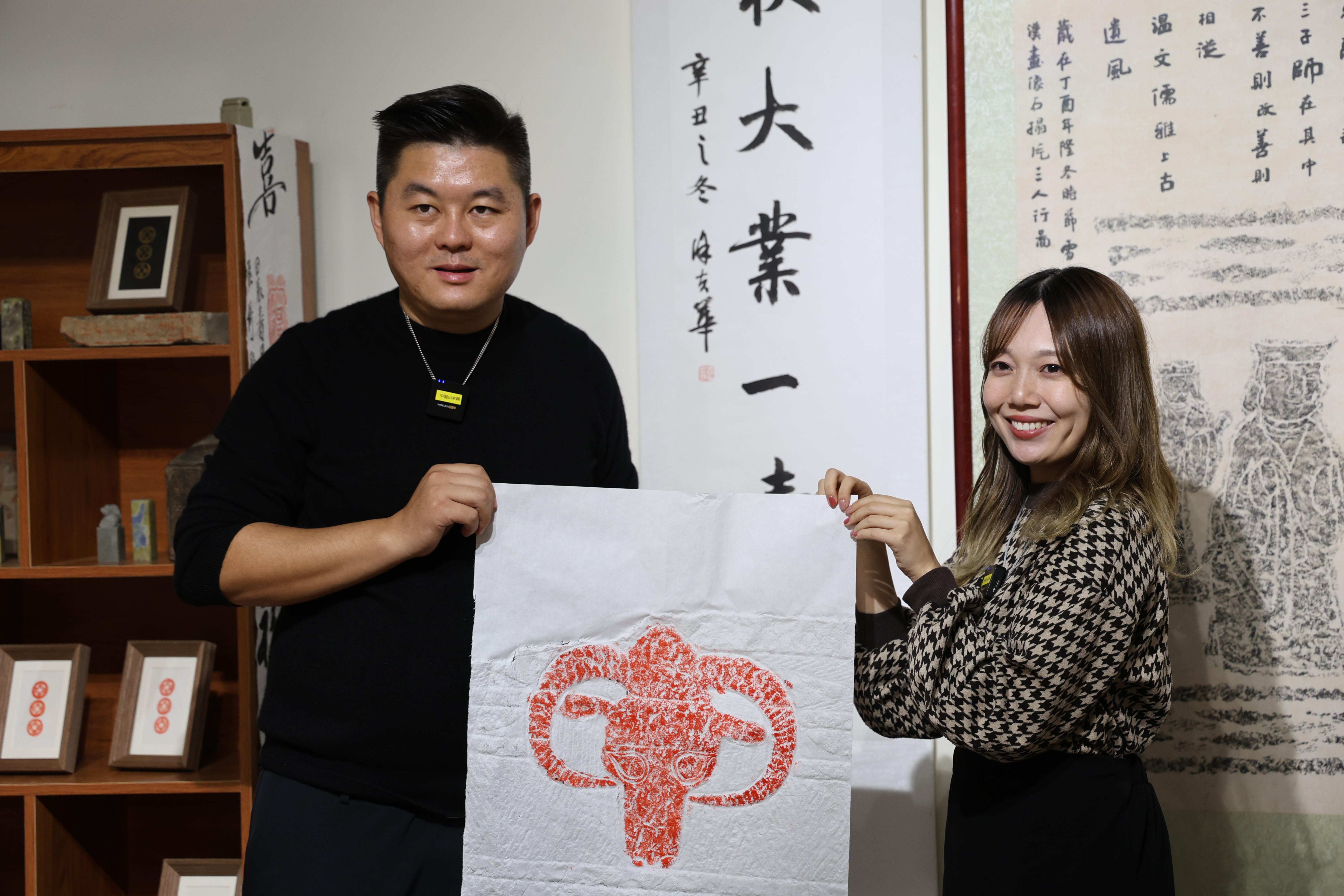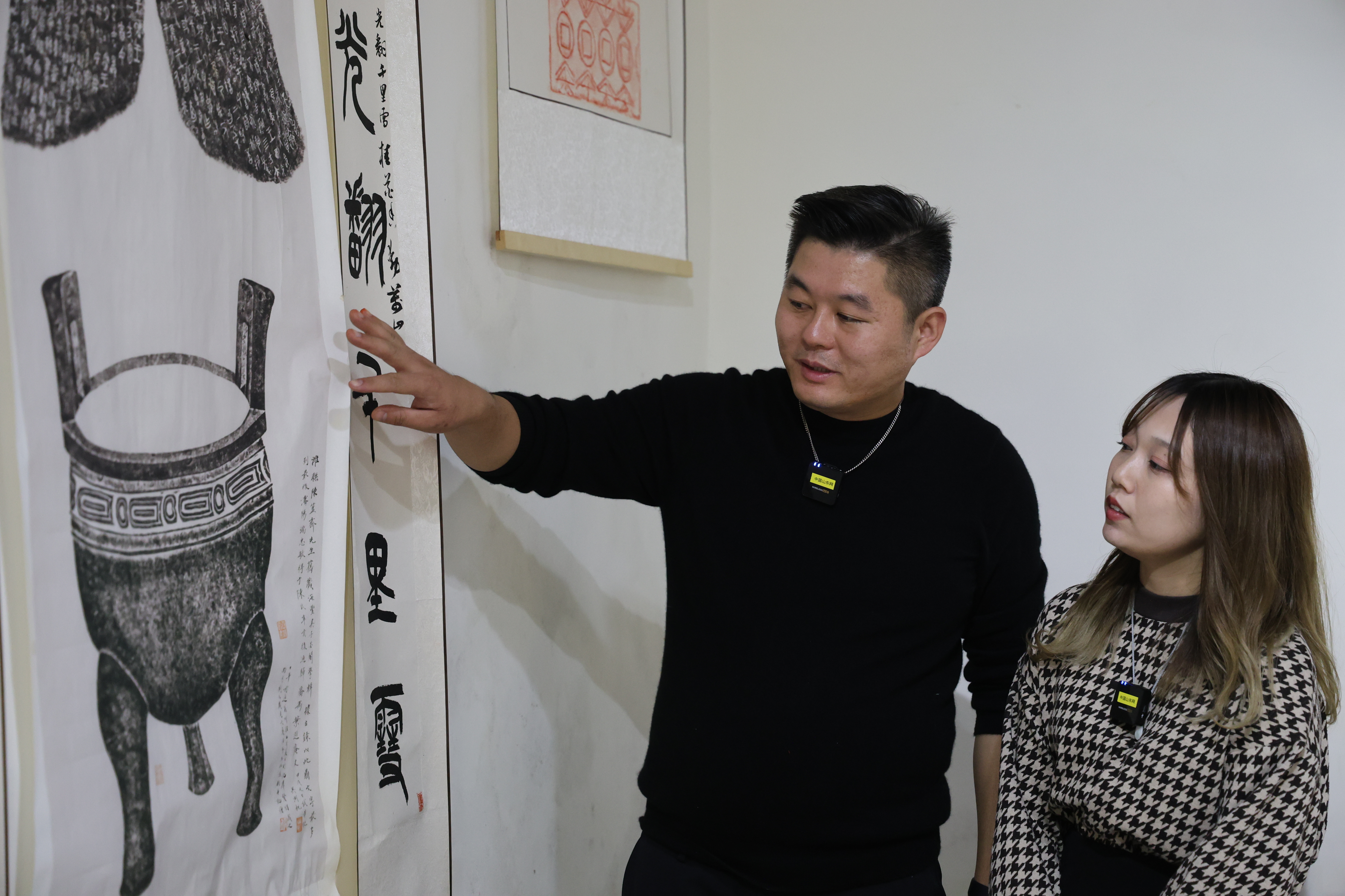金石伝拓技芸の無形文化遺産プロジェクトの代表的な継承者である張奇さんは、寺澤知香さんに金石伝拓について紹介した。金石伝拓は椎拓とも呼ばれ、中国特有の文献を保存するための伝統的な方法である。これは、紙、墨、伝拓道具を用いて金石器物から文字や図画を叩いて印刷する技法である。