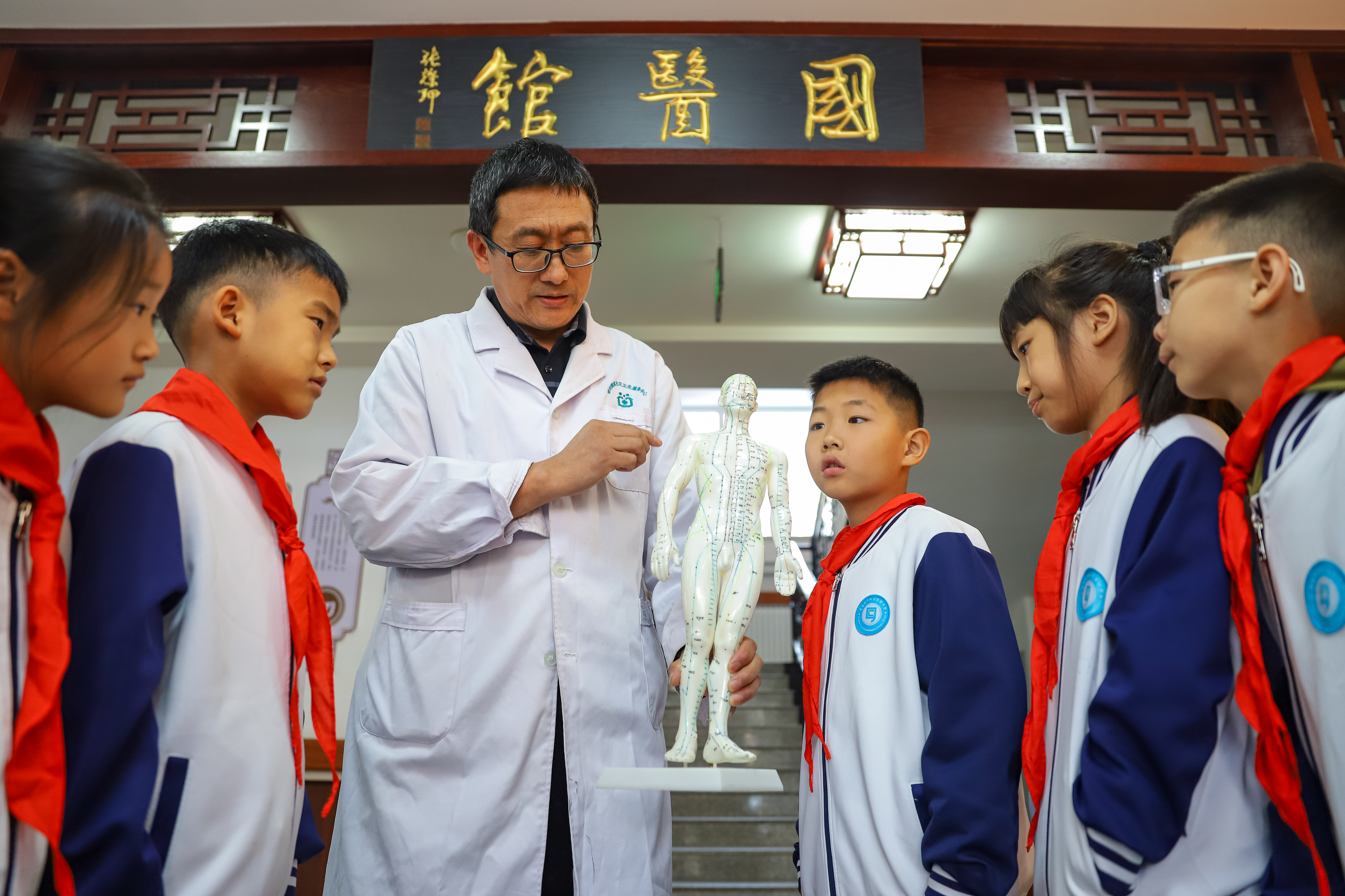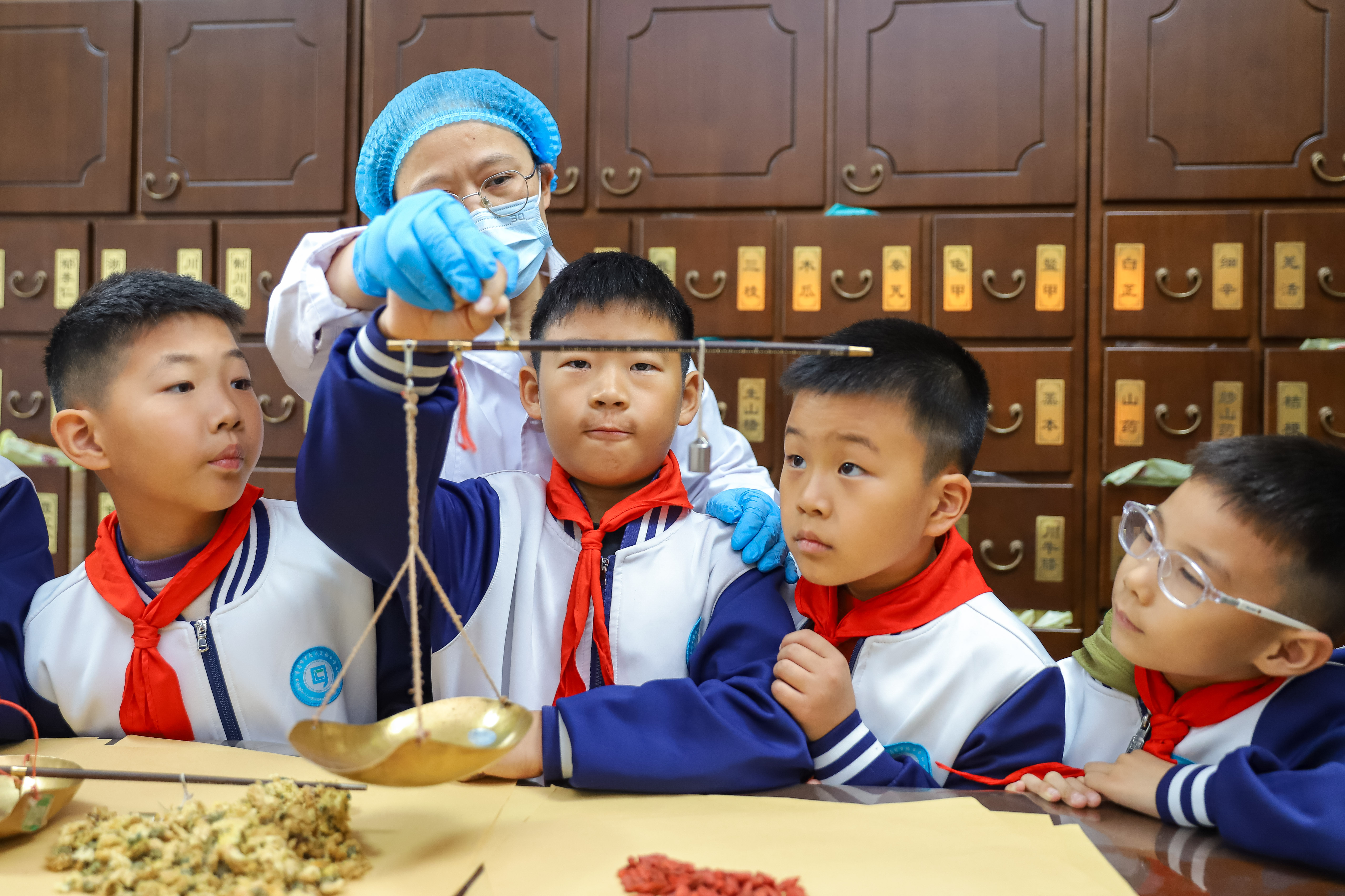 10月21日、世界伝統医薬デーにあたり、山東省青島市李滄区実験小学の生徒たちが李村街道のコミュニティ保健サービスセンターで開催された「中医・中薬知識を学び 中国の伝統文化を感じる」課外実践活動に参加した。生徒たちは中医師の指導の下で、中薬を認識し、薬剤の製造過程を了解し、もぐさ灸を体験し、さらに中医・中薬について間近で理解し、中医の伝統文化の魅力を感じた。(撮影:張鷹)