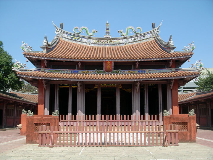 台南孔廟は全台湾で最も歴史が古く、比較的完全に保存されている孔廟である。建設以来、10回以上の修理を経てきたが、ほぼ旧制を維持している。孔子廟全体が古代の宮殿式家屋を模して建てられ、南中国式建築に属している。屋根は伝統的な休山重軒式で、黄色の瑠璃屋根瓦、屋根の両端が反り返っていて、とても優美です。廟門には横の額があり、その上には金色の字で「全台首学」の4字が書かれており、筆跡は雄渾で力強く、孔廟の荘厳さを増した。