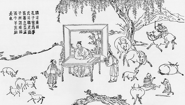 孔子は幼くして父を亡くし、母は貧しく地位も低かった。少年時代に母を亡くし、十数歳で李氏の手下として、牛や羊の放牧をした。心を尽くして働いたので、家畜は健やかに育ち、頭数が増えた。