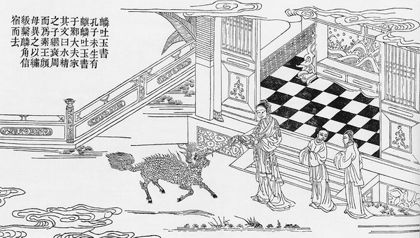 後世の人が編纂した孔子にまつわる逸話で、以下のようなものがある。孔子が生まれた日の夕方、孔子の家に麒麟が降臨し、玉書を吐いた。書には、「水精の子孫、衰えた周をおこして素王となる、母の徴在は賢明である」と書かれていた。これは孔子が凡人ではなく、帝王の位にはいないが、帝王の徳を持つ素王たる事を多くの人に知らしめた。顔徴在は大変驚いたが、一枚の刺繍織を麒麟の角に掛けて謝意を示した。麒麟は夜が明けてやっと去った。この事から「麟吐玉書」は家の者が貴い子を授かり喜ぶ吉兆となり、広く流布した。