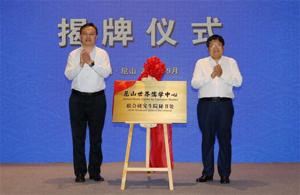 산둥성정부 황훙광(黄红光)부비서장과 니산세계유가학센터 연합대학원 장펑위(臧峰宇)비서장이‘니산세계유가학센터 연합대학원사무처’현판식을 진행하였다.