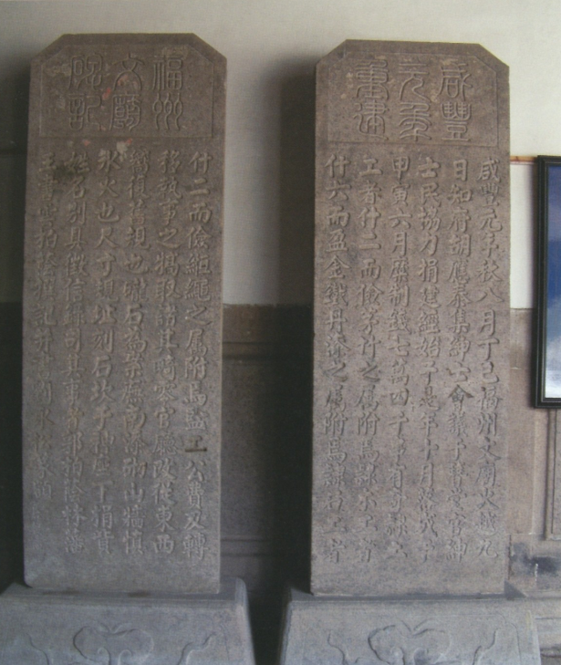 푸저우 문묘의 현존하는 사원은 칭나라 현풍 원년 12월부터 4년 6월까지 지어졌으며, 총 면적은 7,552㎡이고 건축 면적은 4,000㎡이다. 1961년 9월 푸저우시 인민위원회에 의해 1차 시급 문화재 보호 기관으로 지정되었고 1996년 9월 2일 푸젠성 인민 정부에 의해 성급 문화재 보호 기관으로 공포되었다.