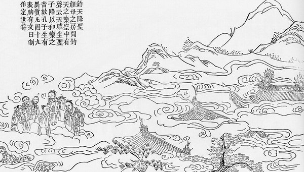 후세 사람들이 공자를 위해 편집한 신기한 이야기.공자가 태어났을 때 어머니 안씨는 방 안에서 하늘에서 선인(仙人)이 음악을 연주하는 것을 들었고,하늘에선'하늘이 성자(盛子)를 낳는다고 느껴서 화락(和乐)의 소리를 내린다.'는 말도 들린다.또 공자는 태어날 때부터 평범한 사람과 달리 49가지의 표기를 가지고 있었다고 전해진다.'해각월준(日角月準), 하목해구(河目海口) 정세부(定世戶) '라는 글자가 있다.