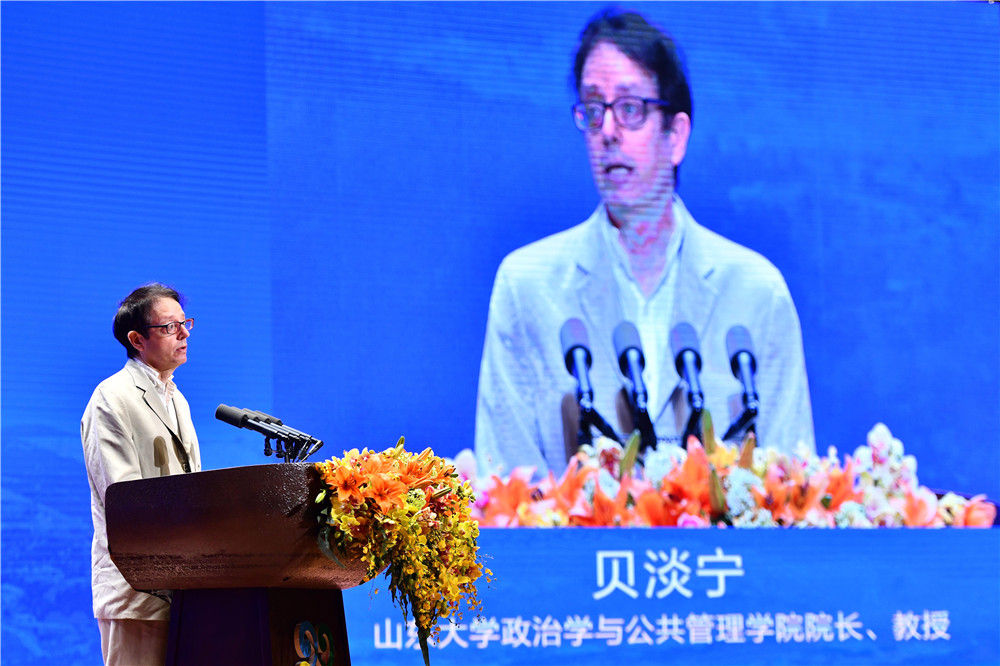 山东大学政治学与公共管理学院院长贝淡宁在开幕上做《公民之间的等级:为人民服务》主旨演讲。 新华社记者 郭绪雷 摄