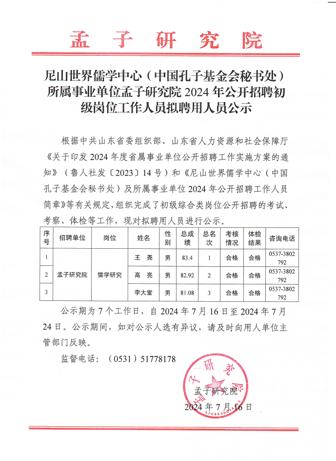 尼山世界儒学中心(中国孔子基金会秘书处)所属事业单位孟子研究院2024年公开招聘初级岗位工作人员拟聘用人员公示