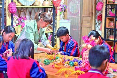 11月28日,在广西岑溪市南渡中心小学,老师在指导小学生练习当地非遗项目——竹芒编织技艺。新华社发
