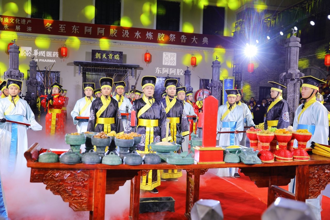 近年来,东阿阿胶持续挖掘、保护传统炼胶仪式,每年冬至在东阿阿胶城举办汲水炼胶祭告大典,弘扬传播中医药文化,传承守护阿胶文化,唤醒广大民众对中医药文化的历史记忆。