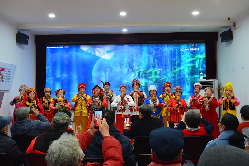 这边“福”字写得热闹,那边孔子学堂活动室里,葫芦丝悠扬的曲调已经响起来了。