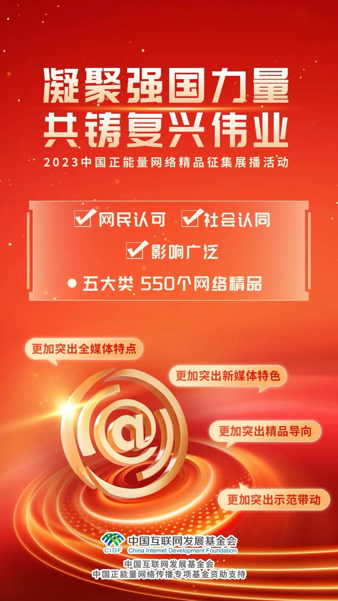 凝聚强国力量,共铸复兴伟业。由中央网信办主办的“2023中国正能量网络精品征集展播”活动今天正式启动网络展播投票,经过初选,1100件作品从征集报送作品中脱颖而出入围终选。