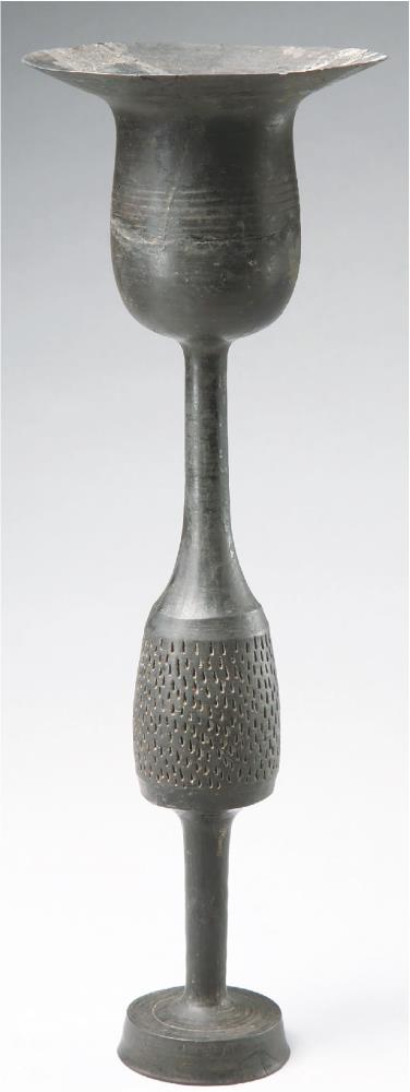 山东大学博物馆陈列了三件蛋壳黑陶高柄杯原件,当然都是经过修复的。对于当年高柄杯的生产技艺,我们现在还不能破解。我们只知道它是轮制的,用轮轴提拉成型的。当时没有金属的轴承,要提拉一个这么薄的陶器,难度很大。目前,有人能够尝试着把它复制出来,但用的是钢材轴承,当时的轴承是木头的,如果现在用木轴承,没有人能把它复制成功,所以它是世界上独一无二的,代表着制陶的最高工艺。