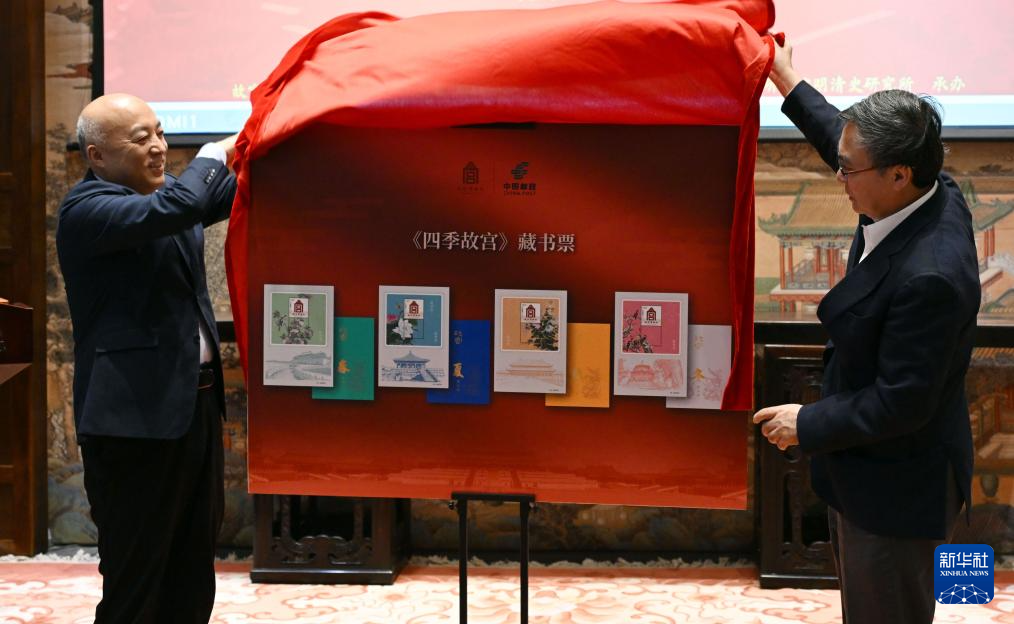 4月7日,故宫博物院院长王旭东(左)、中国邮政集团有限公司党组书记、董事长刘爱力共同为《四季故宫》藏书票揭幕。新华社记者 金良快 摄