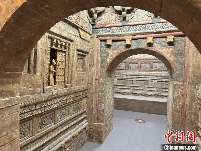 山西博物院展览部工作人员王彤介绍,郝匠金墓于2013年发现于山西省晋城市郝匠社区,为砖砌仿木结构双室墓。前、后墓室均采用砖雕加彩绘的装饰手法,砖雕刻画细腻,彩绘疏密有致。其中孝子故事、妇人启门等砖雕,生动传神,艺术价值颇高。