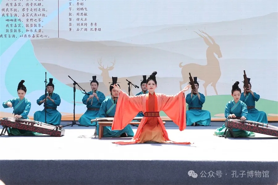 在活动启动仪式上,箫韶乐团带来了《诗经·小雅·鹿鸣》《诗经·小雅·由仪》等雅乐曲目,八音齐鸣,神人以和,仿佛《诗经》千年风雅之遗响;在佾舞展演环节,箫韶乐团展示了明代《阙里志》版祭孔佾舞,管弦翟籥,合止柷敔,以文质彬彬之舞容崇宣孔子的魅力与功绩。
