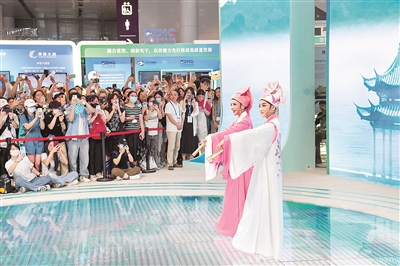 近日,第二十届中国(深圳)国际文化产业博览交易会举行,本届文博会设8个展馆,共有超6000家政府组团、文化机构和企业参展,展出文化产品超过12万件。图为观众在文博会现场观看越剧表演。新华社记者 梁旭 摄