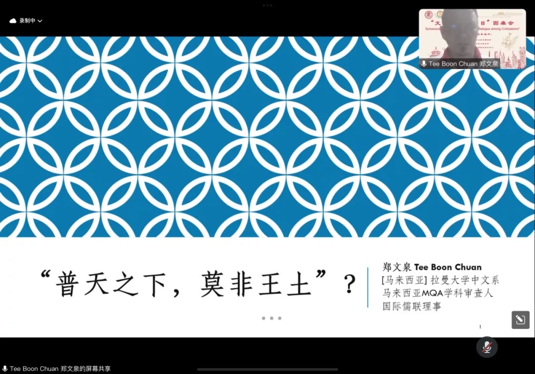 马来西亚拉曼大学教授、MQA学科审查人、国际儒学联合会理事郑文泉(Tee Boon Chuan)结合“普天之下,莫非王土?”这句话,就“文明对话是个坏主意?”“‘述而不作’故千年文明不绝!”“‘率土之滨,莫非王臣’的天下观”等问题予以思考和探讨。郑教授的发言引发较多讨论,大家围绕如何传承中华文化意识,如何维系“述而不作”的传统等问题展开讨论。郑教授强调从事文明对话要去主动沟通转化,化对象化的他者为我们的一部分,发扬孔子“述而不作”的精神,在世界各地都跟周围的文明主动沟通,通过内在化的途径让文明永不断绝,传承发展起来。