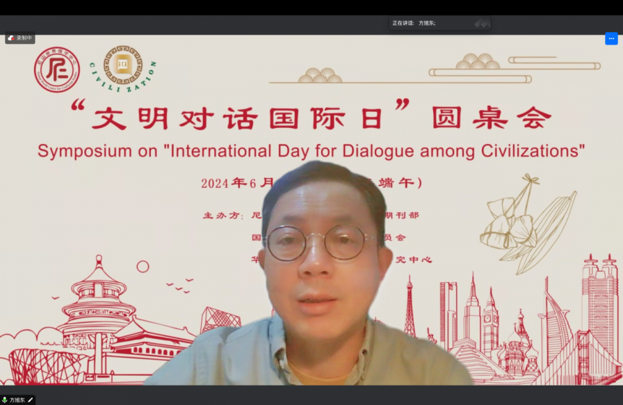 此次圆桌会由华东师范大学文明互鉴研究中心主任、哲学系教授方旭东主持,尼山世界儒学中心(中国孔子基金会秘书处)党委委员、副主任,国际儒学联合会学术委员会副主任,中国人民大学哲学院教授,山东省泰山学者温海明做开场引言。温海明教授表示,今天既是中国传统的端午节,又是联合国新设立的“文明对话国际日”,能够邀请到来自美国、法国、意大利、泰国、马来西亚、印度尼西亚、文莱、新加坡等多国师友一起探讨关于世界文明对话的相关问题具有重要意义。端午节定在农历五月初五,五月正值仲夏,而第一个午日正是登高顺阳的好日子,故而五月初五被称作“端阳节”,午日午时,太阳行至中天,达到最高点,所以也叫“天中节”,象征着阳气壮盛,阳气生长到夏至时分,一年白天日照时间最长。之后一阴初生,进入姤卦,有阴阳相遇之象。从文明对话国际日的意义上,可以理解为东方中华文明的复兴之龙达到一个壮盛状态,开始进入柔顺对外,与其他文明和谐交流的新时代。在这样的天时当中,邀请国内外相关学者一起思考、探讨文明对话,具有重要的时代意义。