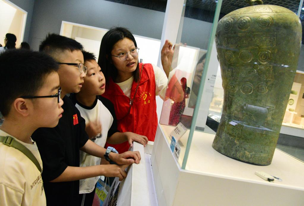 7月14日,在江苏省镇江博物馆,江苏大学志愿者为小朋友介绍文物。新华社发(石玉成 摄)