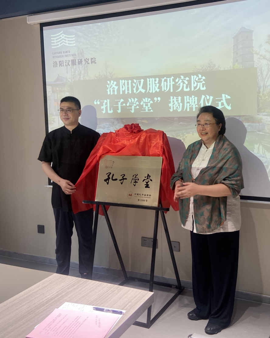 最后,周静与马胜杰共同为洛阳汉服研究院孔子学堂揭牌。周静在总结发言中充分阐述了设立全国首个汉服文化特色孔子学堂的重要意义和独特价值,对洛阳汉服研究院组织名家和有关人员精心设计学堂堂服表示赞赏,希望进一步创意、完善、提升,促进学堂共建,创建汉服文化研学基地,对未来的发展前景充满期待。汉服孔子学堂的设立,有助于坚定文化自信,充分发掘利用洛阳极为丰富深厚的历史文化资源,更好满足人民群众日益增长的精神文化需求,让生活更美好。