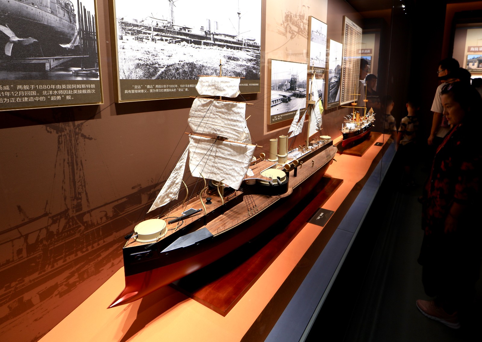 展览分为三个部分,第一部分“归去”通过水下文物、史料记载与历史影像,描绘出北洋海军的兴衰史及甲午海战的惨烈,还有将士们坚韧不拔的战斗精神和英勇气概;第二部分“来兮”则展示了五艘北洋沉舰出水的珍贵文物及水下勘察打捞影像;第三部分“传承”介绍中国水下考古史以及在甲午沉舰的探寻过程中,研究出沉船水下考古的新方法。