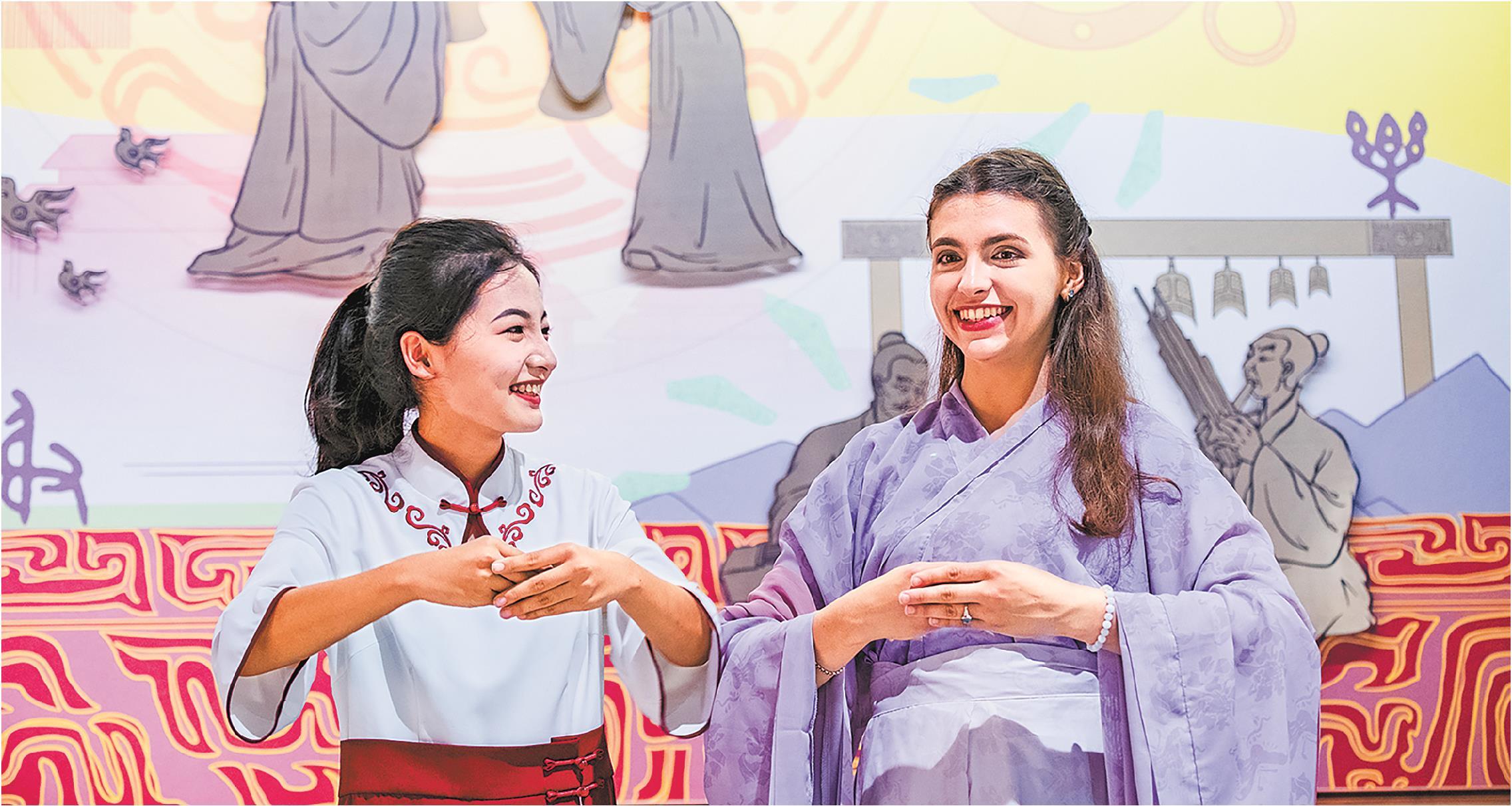 9月18日,在中国教师博物馆,NANA(右)向中国的同学学习揖礼标准动作,为今年孔子文化节期间的敬师礼活动作准备。