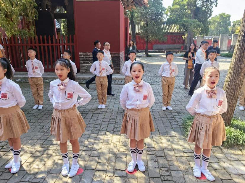 “学而不思则罔,思而不学则殆……”祭孔大典礼成后,在孔庙西华门、东华门两侧,近百位小学生颂唱《论语》经典名句,另一侧书法老师带领中外学生现场书写《论语》,表达对至圣先贤的时代礼敬和对传统文化的薪火相传。