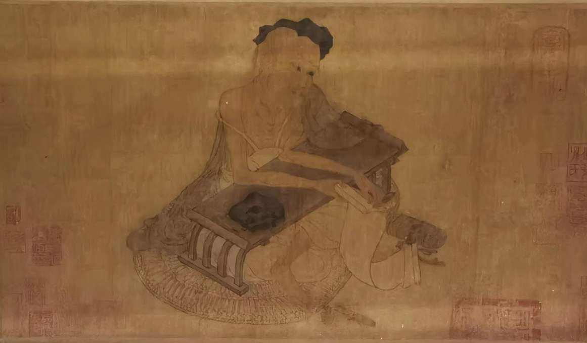 因秦代禁止民间私藏《诗》《书》和百家书籍,伏生冒险将所习《尚书》藏于屋壁之中。汉文帝时,《尚书》濒临失传,朝廷派大臣晁错向伏生求问。伏生以九十岁高龄口授《尚书》二十八篇,令这一重要儒家经典得以传承接续。该卷前有南宋高宗题“王维写济南伏生”及多位名家题跋,长期以来被认为是王维作品。