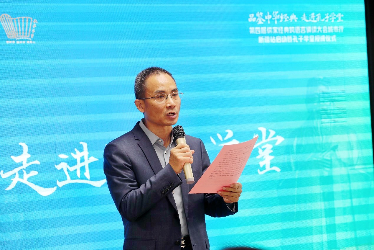 中国孔子网副主编杨光向与会嘉宾做了第四届儒家经典跨语言诵读大会项目推介,并向书香天山科技有限公司孔子学堂颁发大会公益支持单位证书。