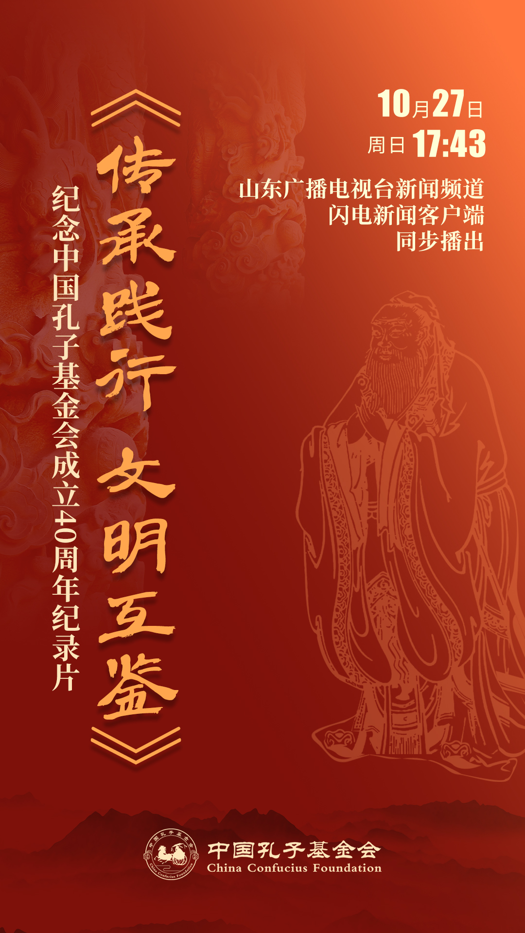 10月27日(周日)17:43,山东广播电视台新闻频道、闪电新闻客户端将同步播出《传承践行 文明互鉴》——纪念中国孔子基金会成立40周年纪录片,让我们一同走进这部纪录片,回顾中国孔子基金会40年光辉历程,共同开启一段探索、传承与创新的文化之旅,敬请关注!